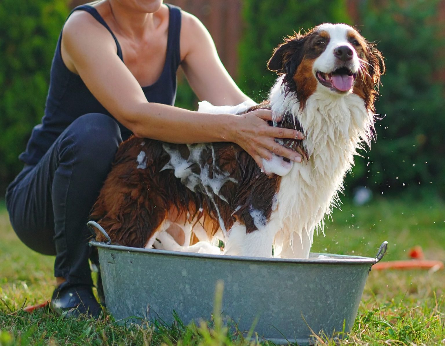 Wichtig: Verwende ausschliesslich Hundeshampoo. Menschenshampoos (auch Babyshampoo!) können den pH-Wert der Hundehaut stören und zu Juckreiz oder Schuppen führen. Es gibt mittlerweile auch natürliche, vegane Shampoos, die besonders sanft zur Haut sind – super für empfindliche Hunde oder Allergiker.